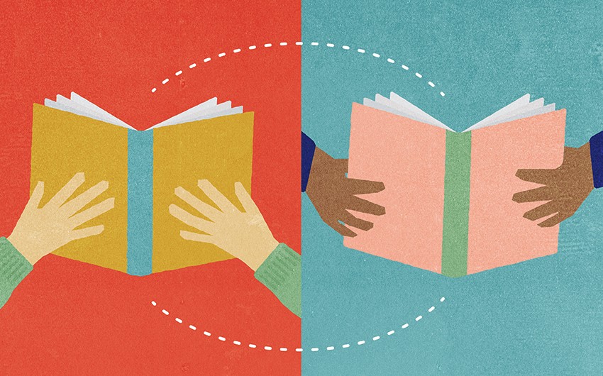 Blue background with dark blue and white illustrations of flowers and plants behind block of yellow with dark blue text
