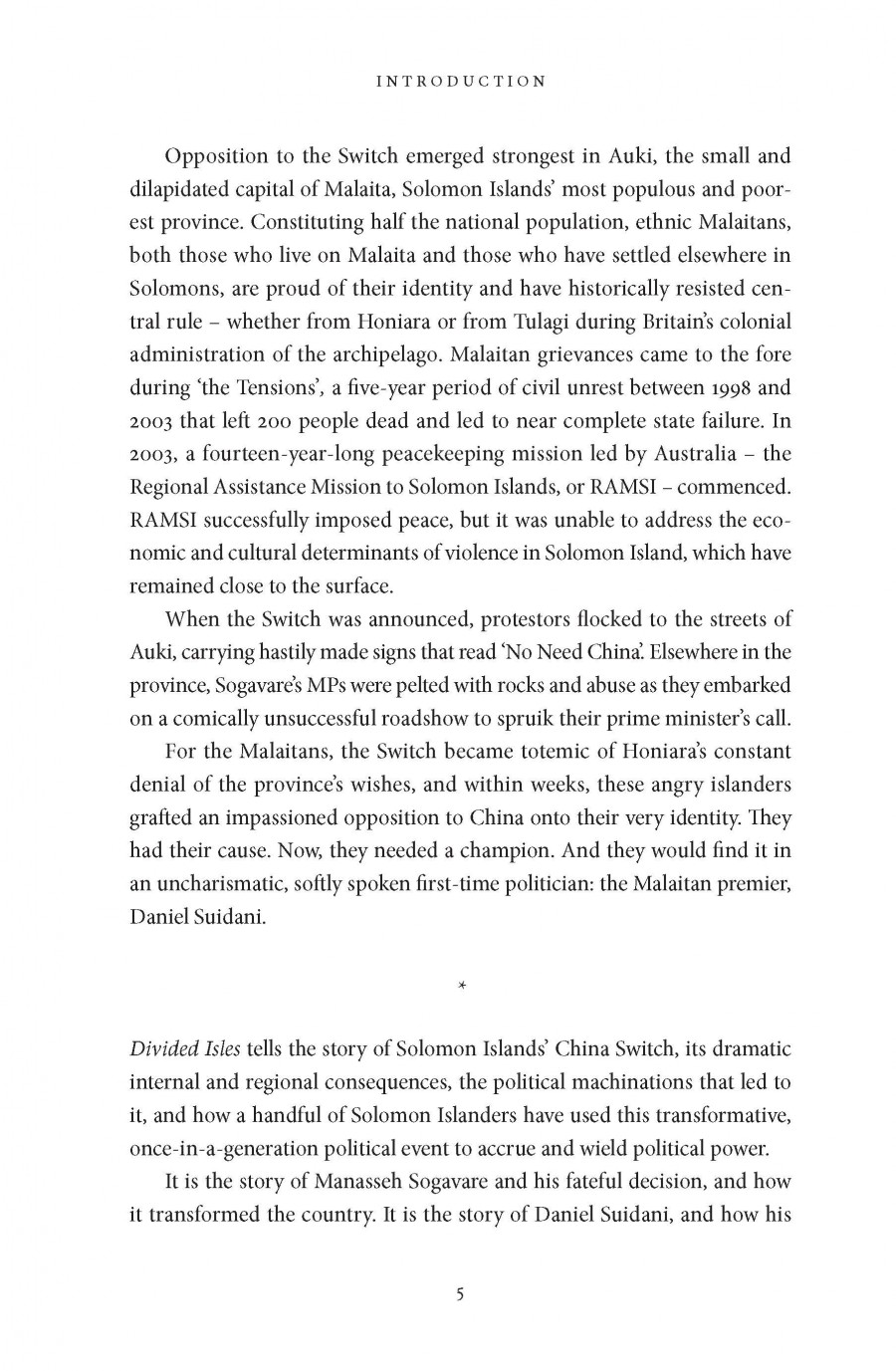 In Divided Isles, Edward Cavanough explains how the switch played out on the ground and its extraordinary potential consequences. He speaks with the dissidents and politicians who shape Solomon Islands' politics, and to the ordinary people whose lives have been upended by a decision that has changed the country – and the region – forever.