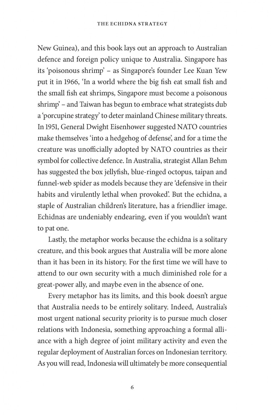 The Echidna Strategy sheds new light on the contest for leadership in Asia and the strategy Australia needs to thrive. This includes a radically different approach to defence. Above all, it means a bolder Australian foreign policy, with three goals: leadership in the Pacific; a much stronger relationship with Indonesia; and a regional order centred on a gathering of its great powers.